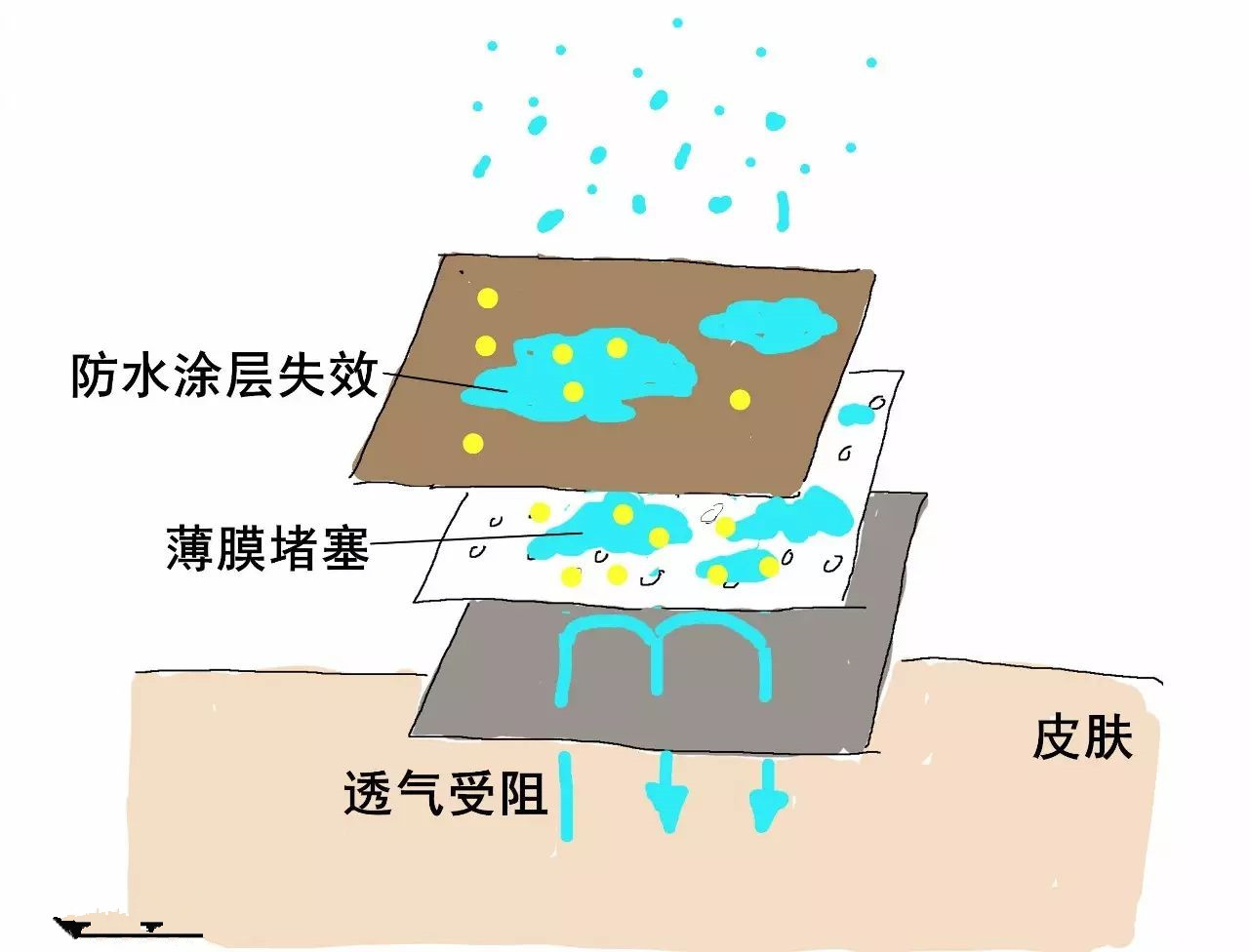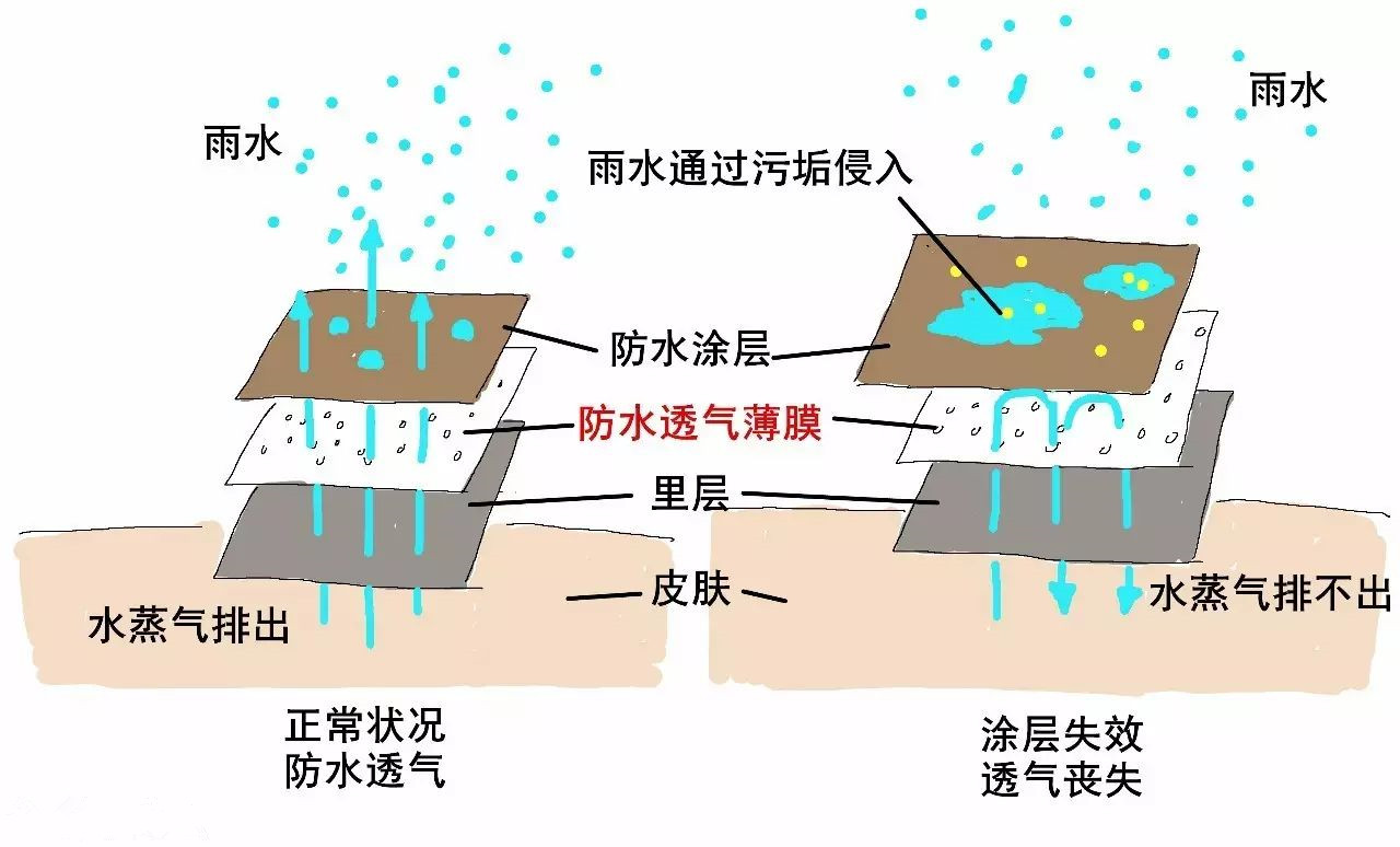 對有薄膜的沖鋒衣而言,如果污垢只是讓涂層失效,雨水并不會進入身體,但涂層失效讓水蒸氣無法逃逸,透氣功能也就失效。