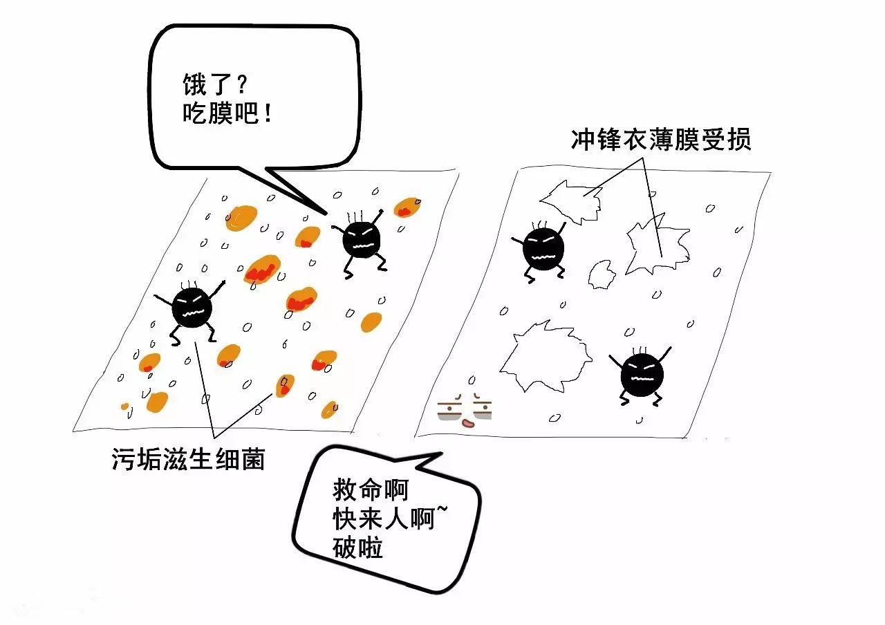 最后:衣服報廢——沾滿汗水、油脂的薄膜是微生物喜食的物件。如果你長時間不清理沖鋒衣,隨著時間的推移,微生物會吃掉薄膜,昂貴的沖鋒衣也隨之報廢。