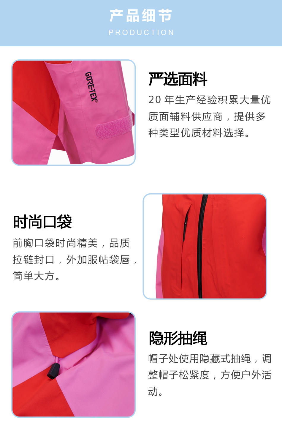 隱形抽繩單層沖鋒衣代工其帽子處使用隱藏式抽繩,調整帽子松緊度,方便戶外活動。