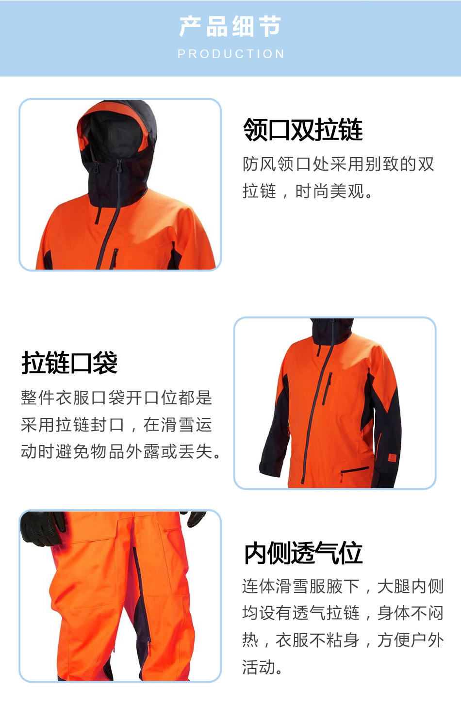 拉鏈口袋:整件衣服口袋開口位都是采用拉鏈封口,在滑雪運動時避免物品外露或丟失。